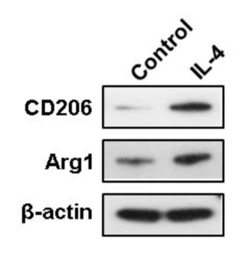 WB,mouse BV-2 cells were treated with 20 ng/ml IL-4 for 48 h,primary antibodies against Arg1 (RM4132,1:1000), CD206 (BD-PT5640,1:1000), and β-actin (B0099,1:5000) from Biodragon (China) |