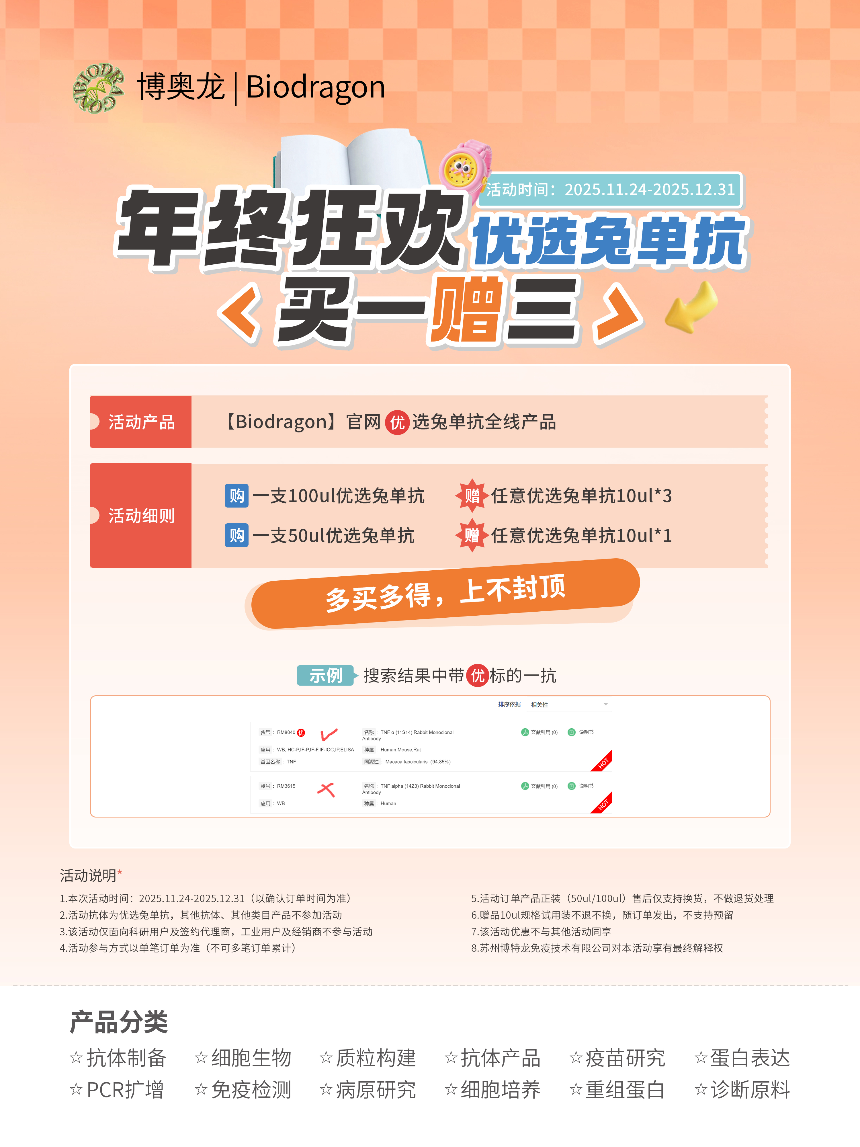 公司主要产品有抗体制备全套产品、病毒包装 相关产品、2万多种科研用抗原抗体、近300 种病理级抗体、几千种重组蛋白,另有WB、 IHC、ELISA、细胞培养相关试剂及诸多特色 产品和特色技术服务。
