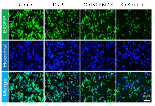 方法:293T-EGFP细胞接种至24孔板过夜密度75%开始Cas9RNP递送实验。CRISPR-Cas9蛋白(1ug/孔)与sgEGFP(0.5ug/孔) 37℃孵育10min,获得CRISPR-Cas9/sgRNA复合物,再将复合物与BioShuttle蛋白转染试剂(2ug/孔)孵育30s,加450ul无血清DMEM稀释。37℃孵育4h后,加入新鲜10%血清培养基,继续培养48h观察结果。 结论:荧光显微镜观察细胞内荧光强度和荧光分布,相较于CRISPRMAX阳性对照组,BioShuttle蛋白转染试剂在此次呈现除了更低的荧光强度,从而说明BioShuttle蛋白转染试剂可安全高效的递送Cas9RNP蛋白质293T-EGFP细胞中,对EGFP位点进行高效的基因编辑。 |