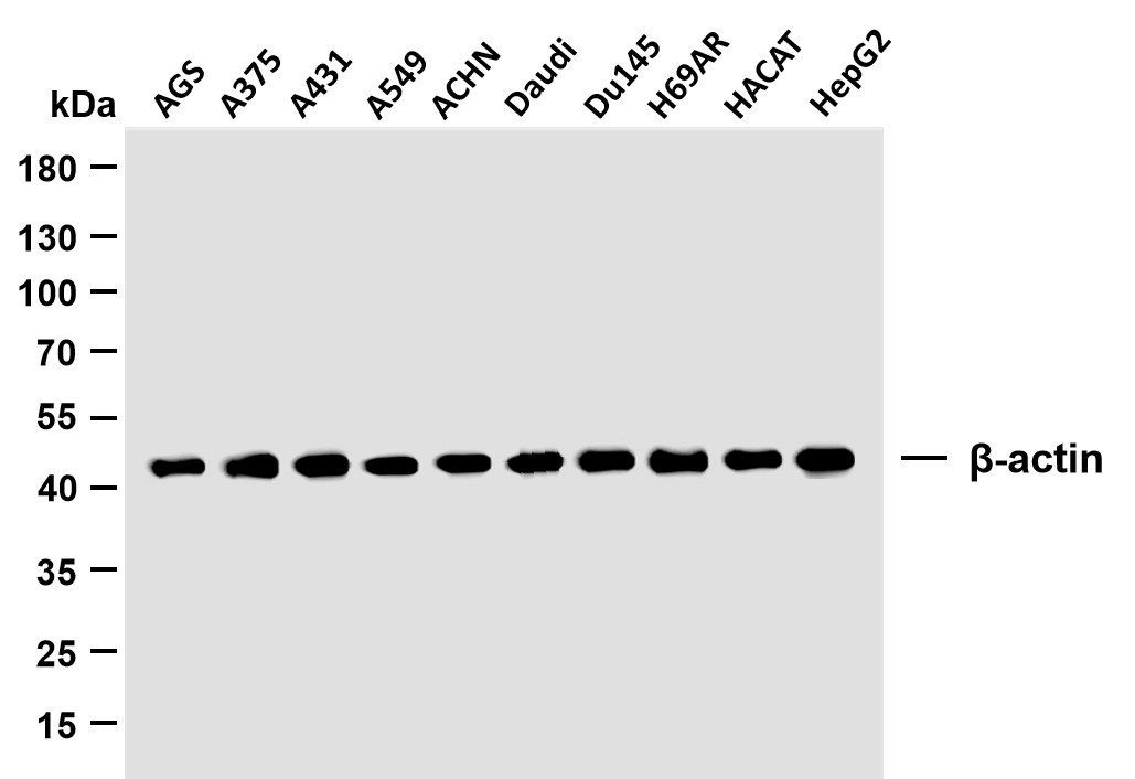 Various whole cell lysates were separated by 10% SDS-PAGE, and the membrane was blotted with anti-β-actin antibody. The HRP-conjugated Goat anti-Mouse IgG(H + L) antibody was used to detect the antibody. Lane 1: AGS Lane 2: A375 Lane 3: A431 Lane 4: A549 Lane 5: ACHN Lane 6: Daudi Lane 7: Du145 Lane 8: H69AR Lane 9: HACAT Lane 10: HepG2 |