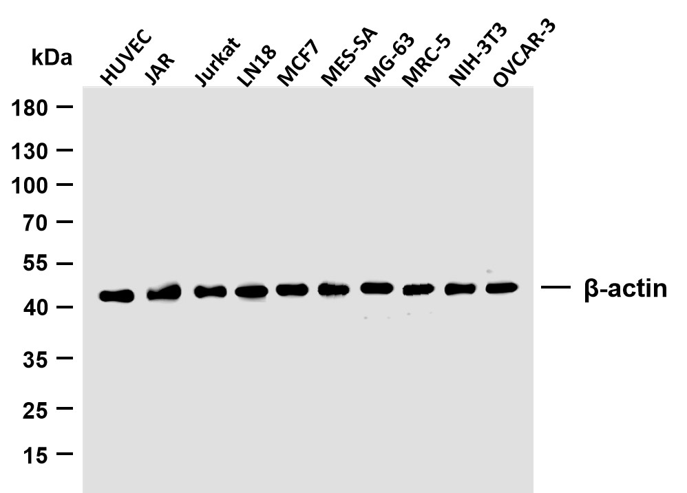Various whole cell lysates were separated by 10% SDS-PAGE, and the membrane was blotted with anti-β-actin antibody. The HRP-conjugated Goat anti-Mouse IgG(H + L) antibody was used to detect the antibody. Lane 1: HUVEC Lane 2:JAR Lane 3:Jurkat Lane 4:LN18 Lane 5:MCF7 Lane 6:MES-SA Lane 7:MG-63 Lane 8:MRC-5 Lane 9:NIH-3T3 Lane 10:OVCAR-3 |