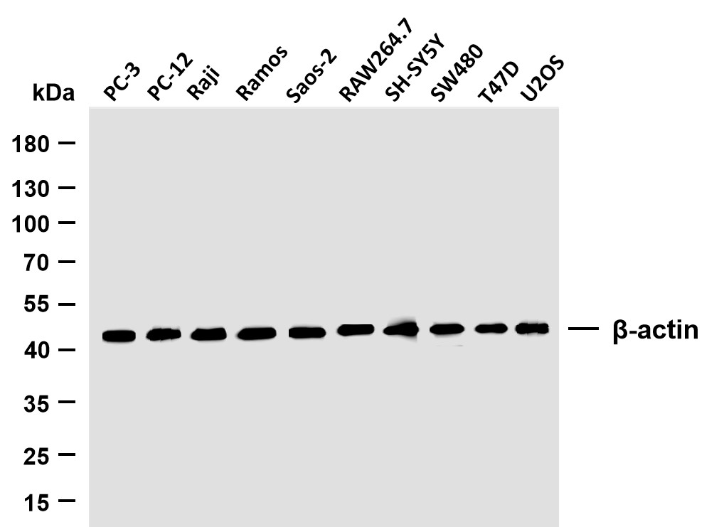 Various whole cell lysates were separated by 10% SDS-PAGE, and the membrane was blotted with anti-β-actin antibody. The HRP-conjugated Goat anti-Mouse IgG(H + L) antibody was used to detect the antibody. Lane 1: PC-3 Lane 2: PC-12 Lane 3: Raji Lane 4: Ramos Lane 5: Saos-2 Lane 6: RAW264.7 Lane 7: SH-SY5Y Lane 8: SW480 Lane 9: T47D Lane 10: U2OS |