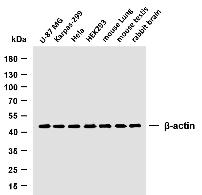 Various whole cell lysates were separated by 10% SDS-PAGE, and the membrane was blotted with anti-β-actin antibody. The HRP-conjugated Goat anti-Mouse IgG(H + L) antibody was used to detect the antibody. Lane 1: U-87 MG Lane 2: Karpas-299 Lane 3: Hela Lane 4: HEK293 Lane 5: Mouse Lung Lane 6: mouse testis Lane 7: Rabbit brain |