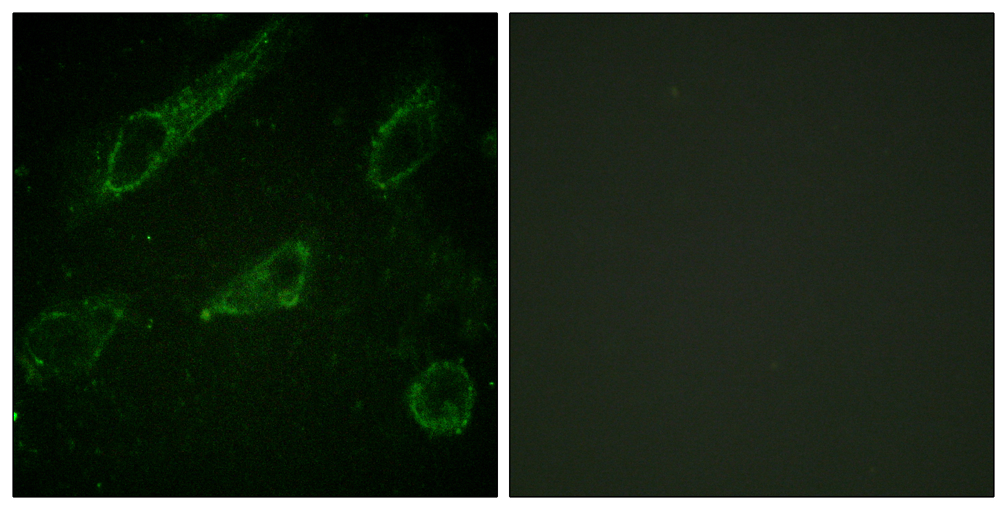 Immunofluorescence analysis of HeLa cells, using c-Abl (Phospho-Tyr245) Antibody. The picture on the right is blocked with the phospho peptide. |
