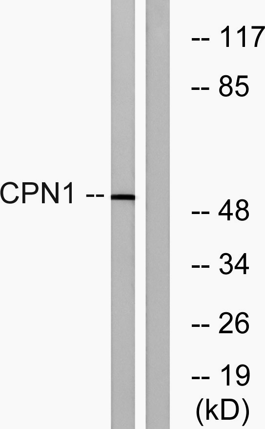Western blot analysis of lysates from RAW264.7 cells, using CPN1 Antibody. The lane on the right is blocked with the synthesized peptide. |