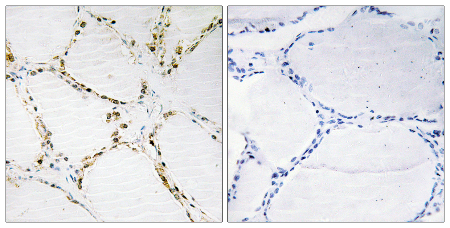 Immunohistochemistry analysis of paraffin-embedded human thyroid gland tissue, using FOXO1A/3A Antibody. The picture on the right is blocked with the synthesized peptide. |