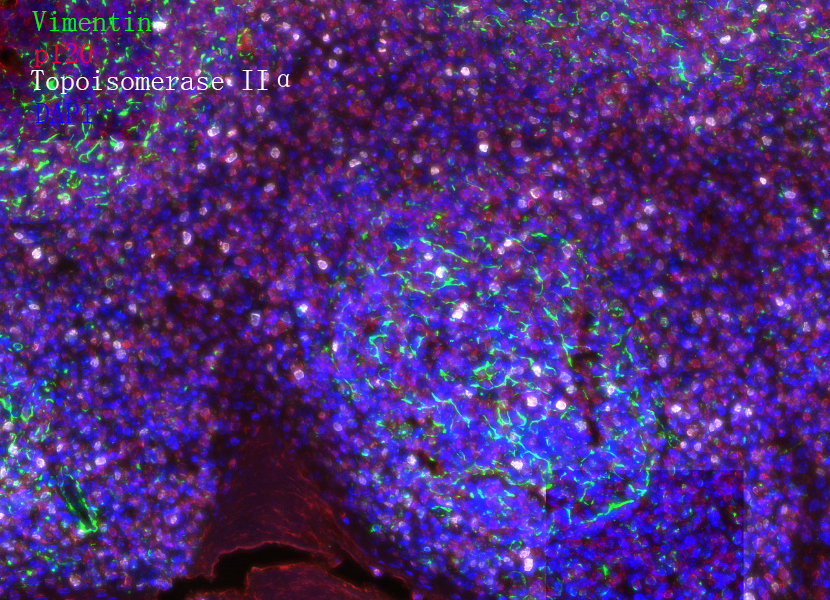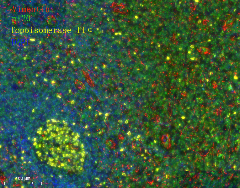 The section was incubated in 3 rounds of staining; sequentially for Anti-Vimentin (1:200), Anti-p120 (1:200), Anti-Topoisomerase IIα (1:200).; each using a separate fluorescent tyramide signal amplification system. EDTA based antigen retrieval (Leica Biosystems BOND® Epitope Retrieval Solution 2, pH 9.0, 20 minutes) was used in between rounds of tyramide signal amplification to remove the antibody from the previous round, to avoid any cross-reactivity. DAPI (dark blue) was used as a nuclear counter stain.