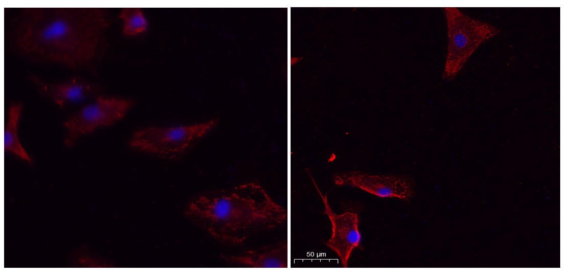 Immunofluorescence analysis of un-treated (left) A549 and UV treated(right) A549 cell. 1,primary Antibody was diluted at 1:200(4°C overnight). 2, Goat Anti Rabbit IgG (H&L) - Alexa Fluor 594 Secondary antibody was diluted at 1:1000(room temperature, 50min).3, Picture B: DAPI(blue) 10min. |