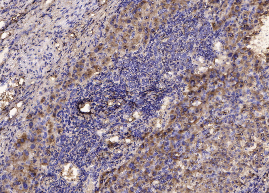 Immunohistochemical analysis of paraffin-embedded human Moderately differentiated hepatocellular carcinoma Antibody was diluted at 1:200(4° overnight). |