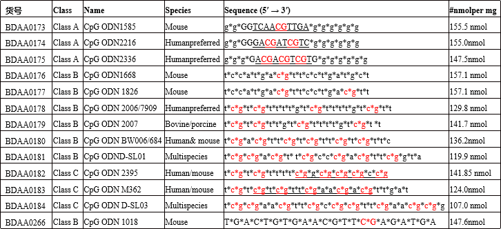 A类CpG ODN以含有CpG二核苷酸的回文序列为核心,两端为poly G尾,磷酸二酯键骨架为部分硫代修饰,通过回文序列和poly G形成高级结构,能够活化浆细胞样树突状细胞诱生大量I型干扰素,对B细胞活性弱。 B类CpG ODN是一种全硫代修饰的线性CpG ODN,对B细胞有很强的免疫刺激活性,但不能活化浆细胞样树突状细胞。 C类CpG-ODN是一类全硫代修饰的CpG ODN,能通过回文序列形成二聚体,兼具A型和B型CpG-ODN的活性,既能活化浆细胞样树突状细胞,又能活化B细胞。